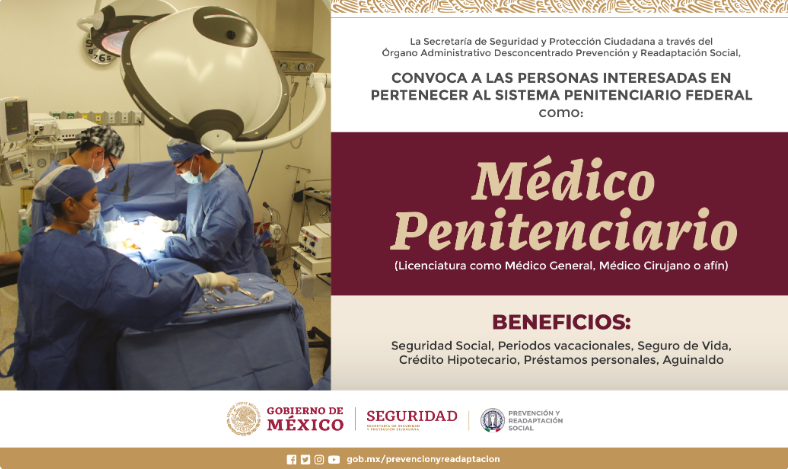 La Secretaría de Seguridad y Protección Ciudadana (SSPC), a través del Órgano Administrativo Desconcentrado Prevención y Reinserción Social (OADPRS), anunció una nueva convocatoria dirigida a personal médico y de enfermería interesado en integrarse al sistema penitenciario federal. La iniciativa busca fortalecer los servicios de salud al interior de los centros de reinserción social del país y ampliar la cobertura de atención médica en contextos de alta complejidad.