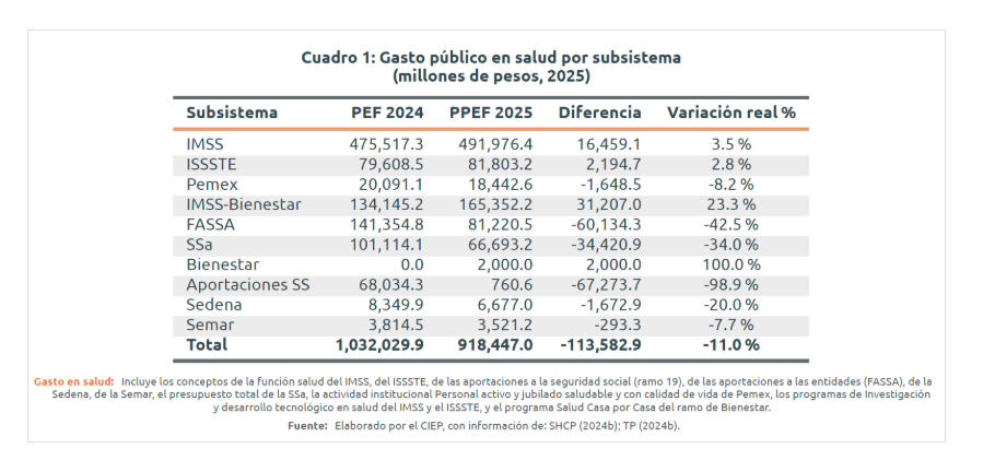 Cuadro 1. Gasto público en salud por subsistema, 2025 (millones de pesos). Fuente: Centro de Investigación Económica y Presupuestaria (CIEP) con información de SHCP (2024b) y Transparencia Presupuestaria (2024b).