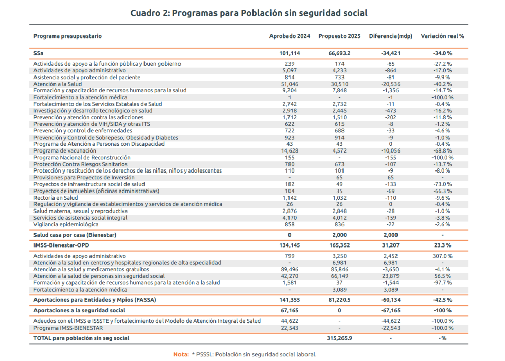 El “Cuadro 2: Programas para población sin seguridad social” complementa perfectamente la narrativa del artículo, ya que muestra con detalle los recortes por programa presupuestario dentro de la Secretaría de Salud, el IMSS-Bienestar y el FASSA.