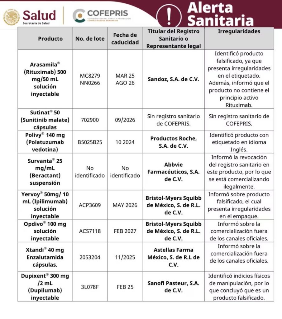 Cofepris identificó una lista de medicamentos de uso oncológico, inmunológico y antiviral que se distribuyen sin autorización sanitaria o son falsificados. Entre ellos se encuentran: