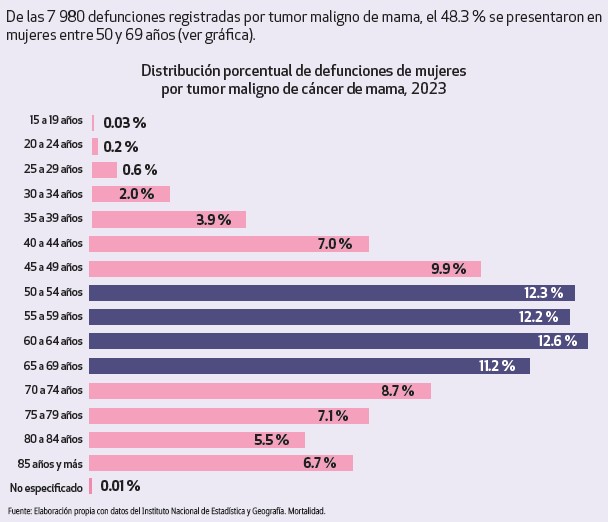 El cáncer de mama continúa siendo una de las principales causas de mortalidad femenina en México. Según el Instituto Nacional de Estadística y Geografía (INEGI), en 2023 los tumores malignos representaron la tercera causa de muerte entre mujeres, con 7,980 defunciones registradas atribuidas al cáncer de mama.