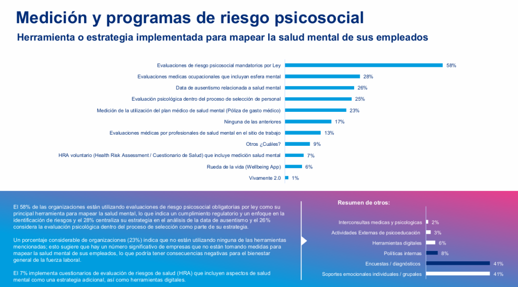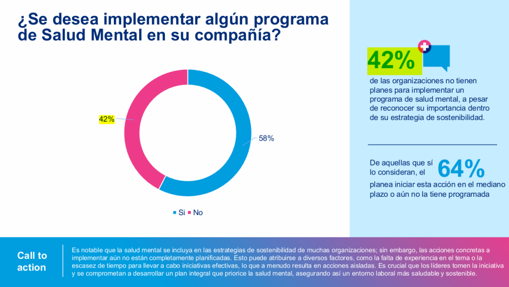 El informe evidencia que 42% de las empresas no tiene previsto implementar programas de salud mental en el corto plazo, a pesar de reconocer su importancia. Solo una de cada cinco organizaciones ha desarrollado esquemas preventivos, de educación emocional o detección temprana.